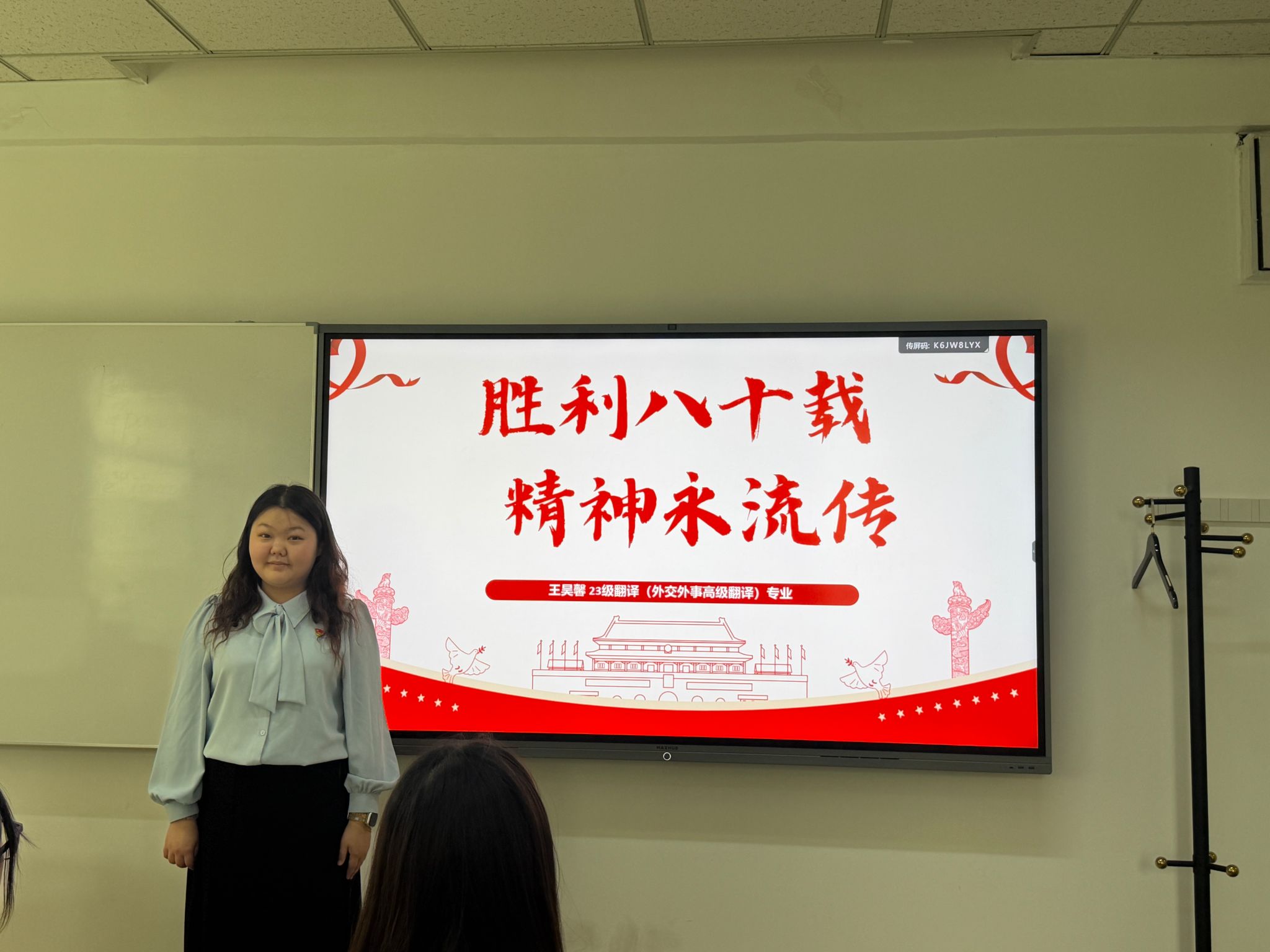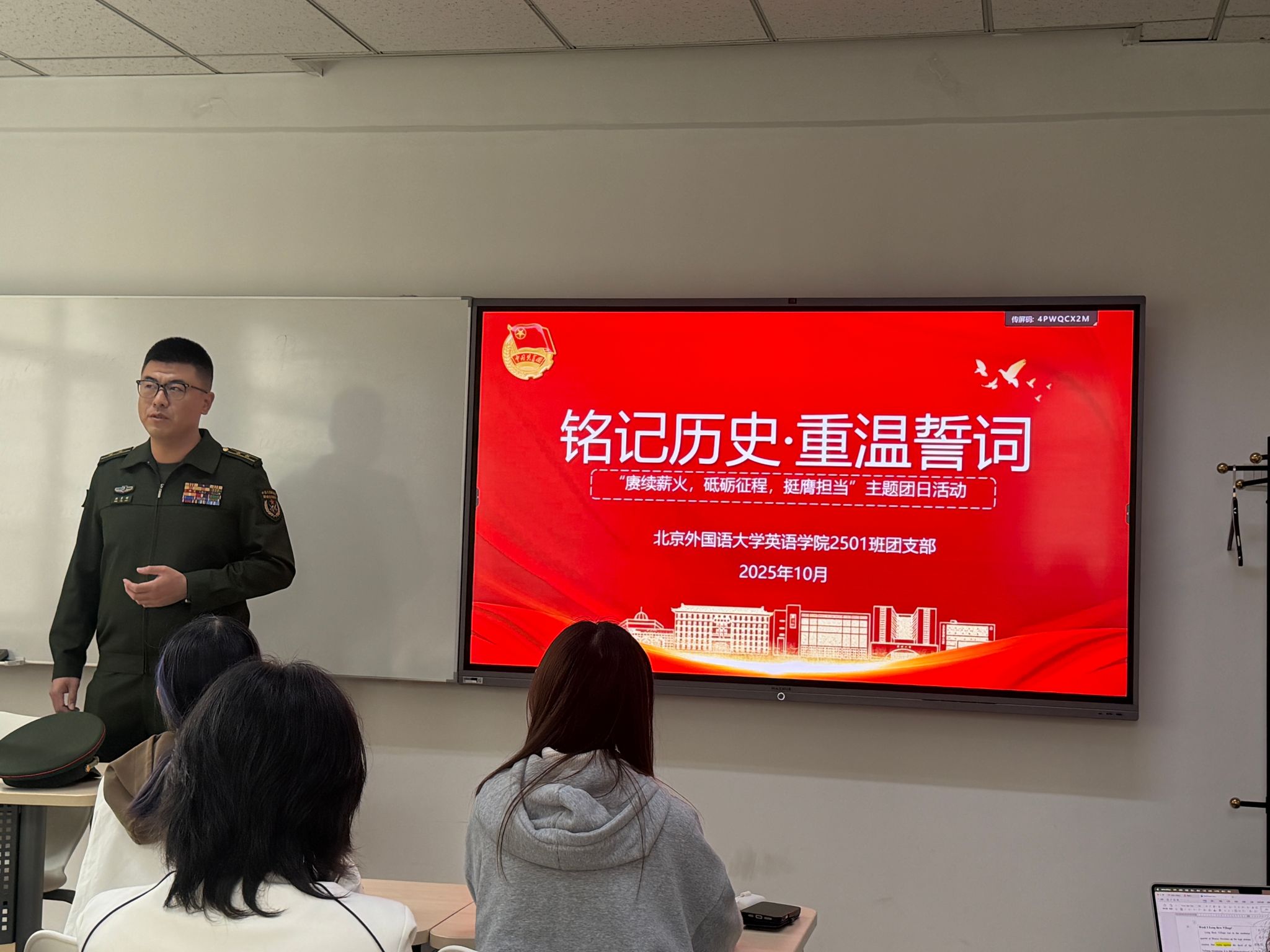 10月12日,系列活动在校园内继续开展。团总支特邀参加“九三阅兵”的中国人民解放军某部队中校参谋拱彦硕及我校曾参与“九三阅兵”志愿服务的2023级本科生王昊馨进行分享。拱彦硕参谋结合自身参加2019年和今年两次阅兵工作的经历,生动讲述了阅兵训练与筹备背后的细节,指出“‘保家卫国’从不是一句口号,而是党和人民赋予的使命;这份担当,与青年‘强国复兴有我’的追求高度契合。”王昊馨谈到:“能够运用专业能力服务阅兵活动,是践行北外‘语言报国’精神的生动体现,更是落实‘请党放心,强国有我’青春誓言的实践行动。”团员代表李依静、朱馨莹先后发言,表示将以使命感深耕外语专业、把个人理想融入党和国家事业。