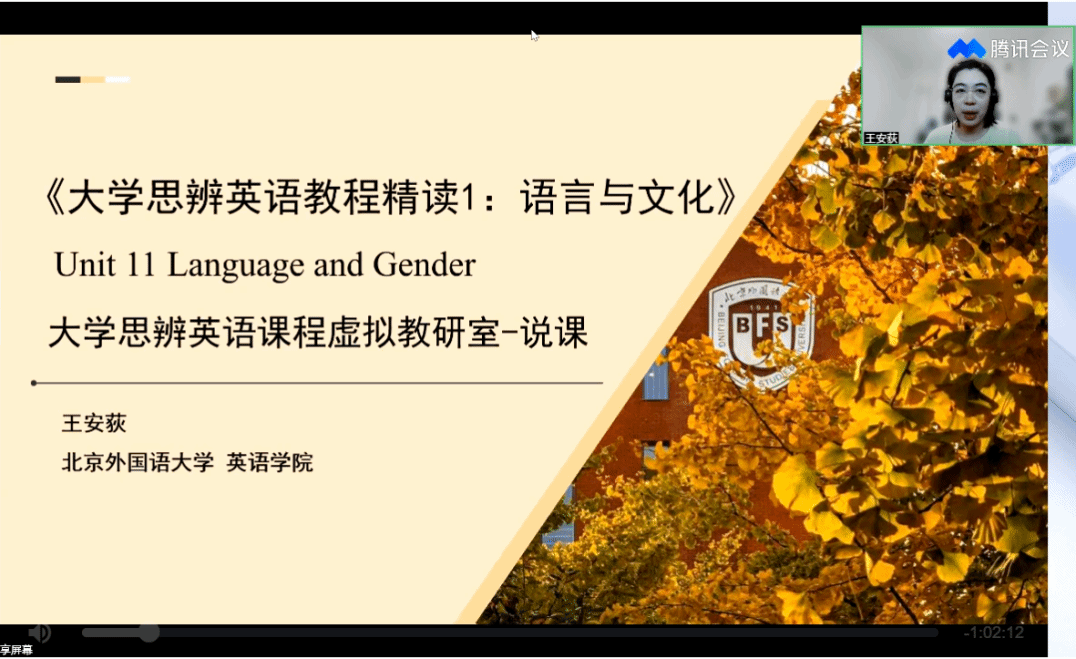 王安荻老师担任主讲,围绕《大学思辨英语教程精读1:语言与文化》第11单元展开,吸引了来自全国的一千六百余名教师线上参与。