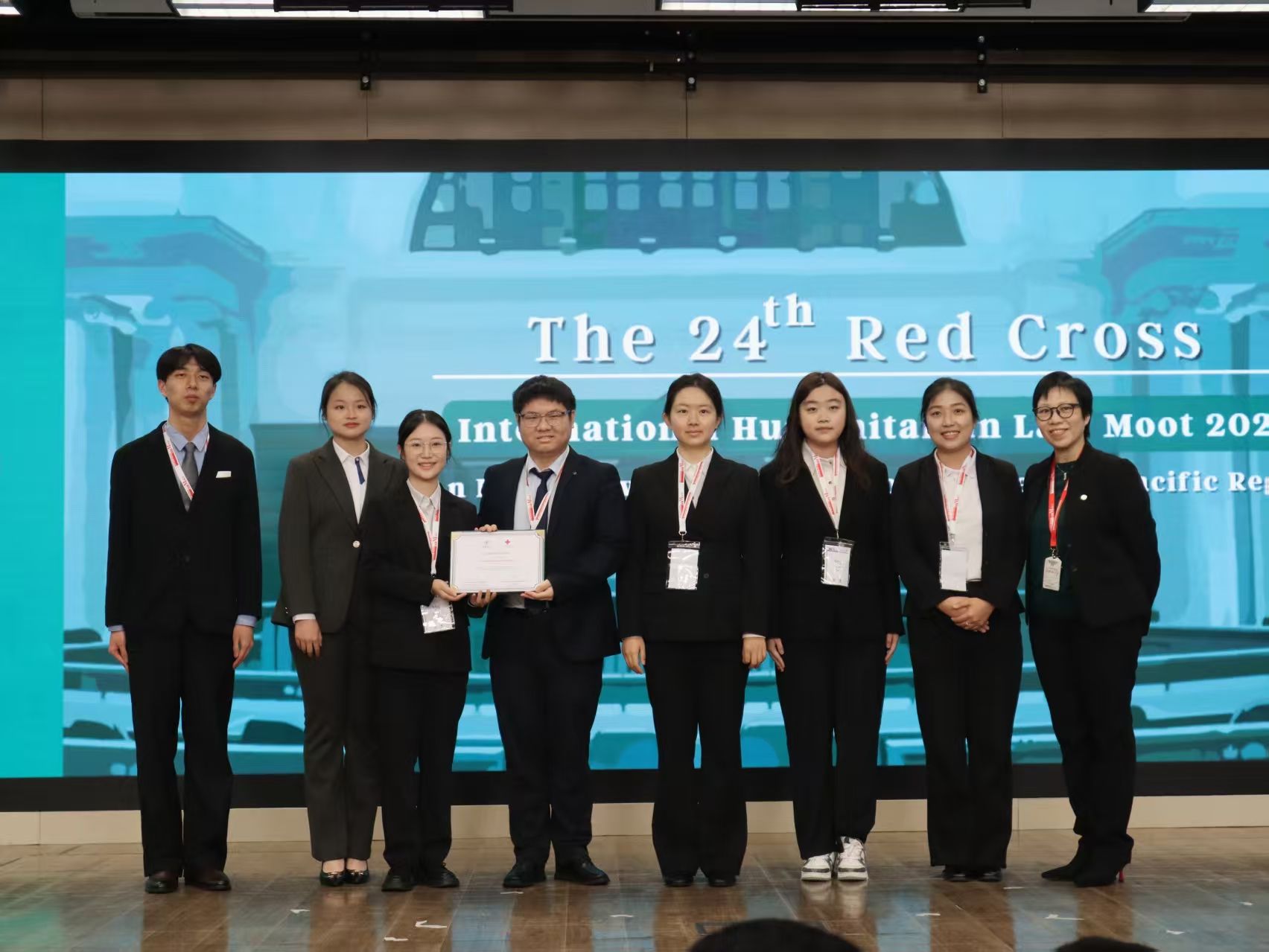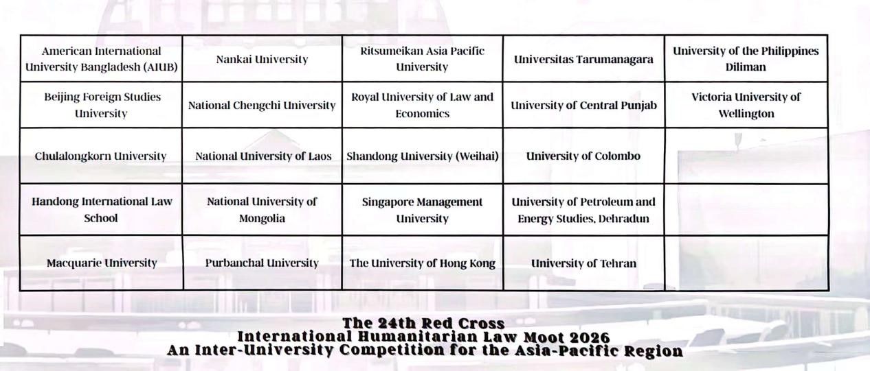 站在亚太赛的赛场上回望,从2025年5月到2026年3月,近一年的时间,从国内赛到亚太赛,我们跟随着红十字国际委员会的脚步,一次次触摸国际人道法在真实世界中的脉动。每一场比赛都是一次深度学习:在法官渊博的提问中领略法律的深邃,在对手完美的陈述中看见自己的不足,在不断修正与突破中体会人道法平衡军事必要与人道需求的精妙,这些瞬间都让人深感压力的同时也非常享受。从一场场比赛中走来,我们以惶恐之心求知,以信任之心相持,以谦卑之心学习。当比赛真的告一段落,心中满是对人道法的不舍,不舍那些彻夜讨论的夜晚,不舍法庭上思维碰撞的瞬间,更不舍这门充满温度的法律带来的感动。
