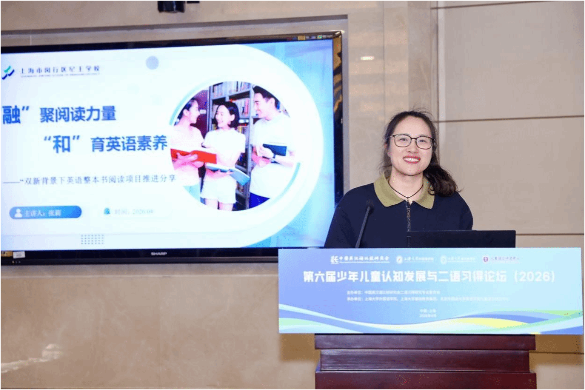第六场主旨报告由上海大学外国语学院英语系主任马拯副教授主持。上海市闵行区纪王学校张莉副校长以“‘融’聚阅读力量,‘和’育英语素养”为题,分享了学校全学段英语整书阅读项目实践经验。她从课程教学、校园活动、教师发展、综合评价四大维度,展示了如何通过多维度融合实践,让整书阅读融入校园生活方方面面,提升学生英语核心素养,并表示,将进一步深化理论学习应用、加强推广与分享、推动创新与发展。