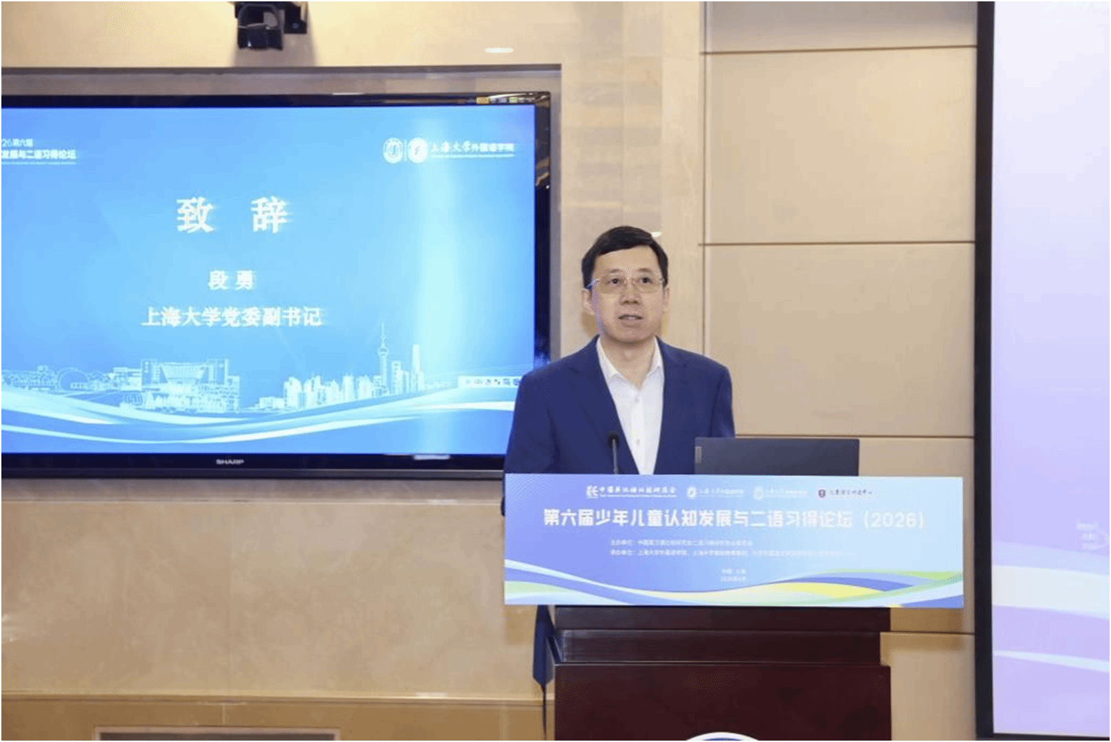 首先,上海大学党委副书记段勇教授做开幕式致辞,他代表上海大学向与会专家学者表示热烈欢迎,并向专家们介绍了上海大学近年来的发展成就、上海大学外国语学院外语学科建设进展以及与上海大学基础教育集团和探花av