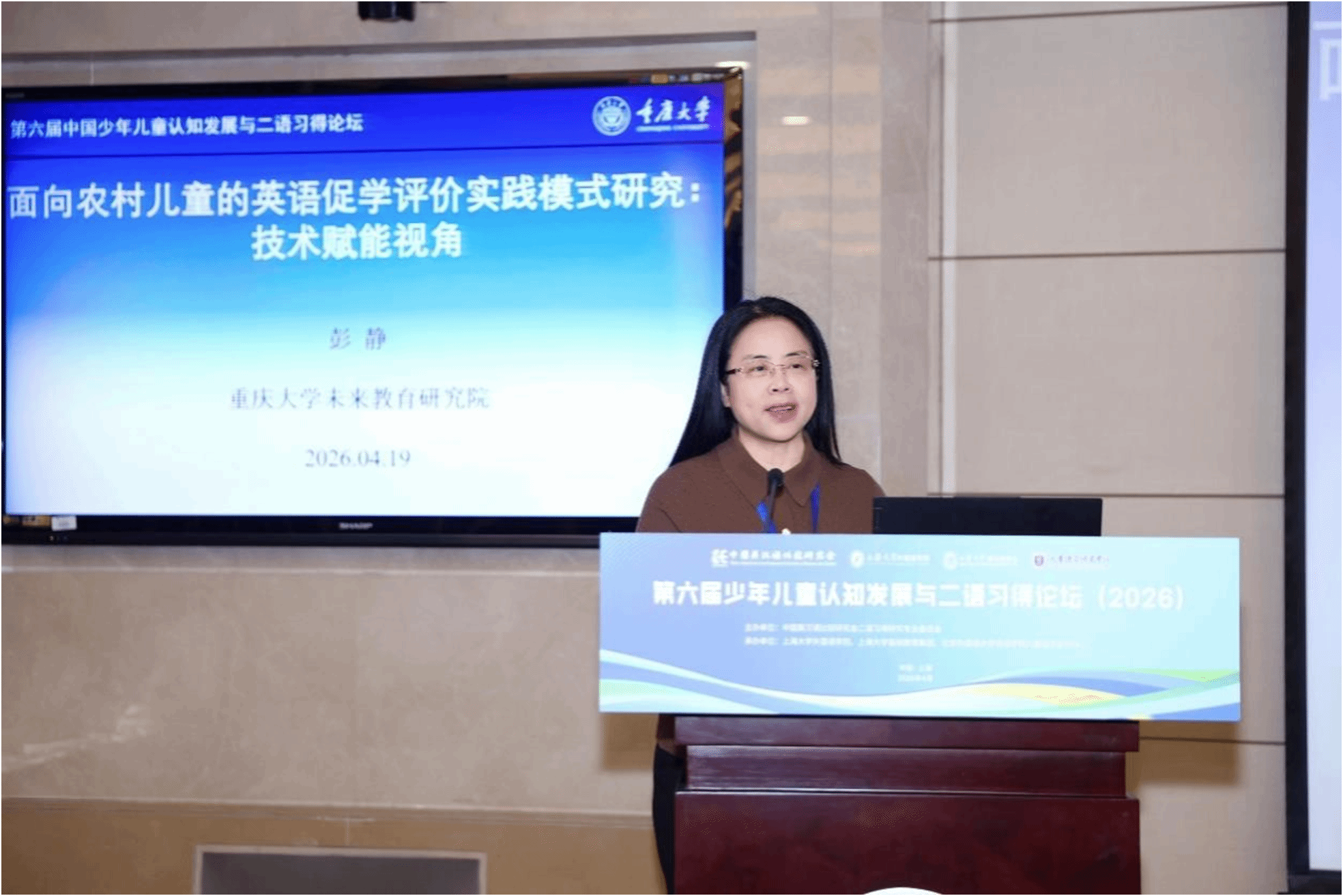 第四场主旨报告由上海大学外国语学院副院长张建琴副教授主持。重庆大学彭静教授作了题为“面向农村儿童的英语促学评价实践模型研究:技术赋能视角”的报告。她指出,“促学评教”的研究存在两大失衡:一是理论研究多于实践研究,二是学段覆盖与区域分布不均。由此,她提出构建一套技术赋能的农村中小学英语促学评价模式,从学习目标与标准、评价活动与任务、促学反馈、学生自评、同伴互评五个维度进行系统设计,为农村儿童外语教学促学评价提供实践范式。
