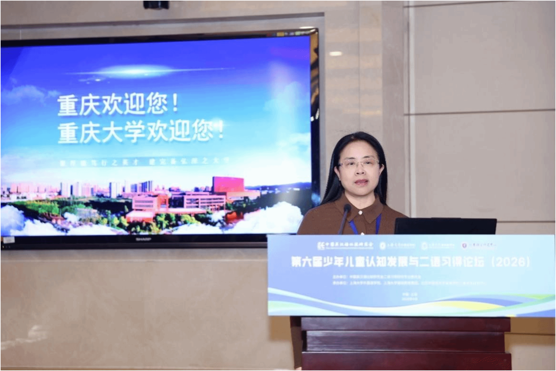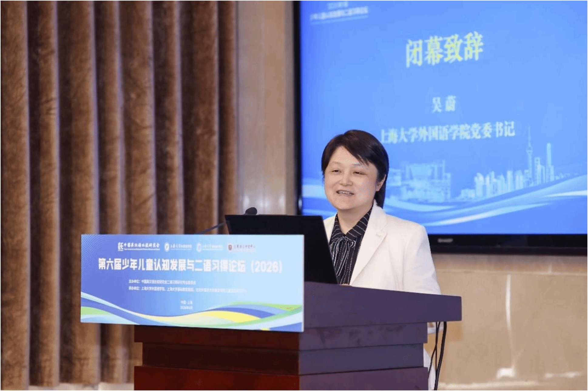 4月19日中午,论坛闭幕式在乐乎新楼学海厅举行,闭幕式由上海大学外国语学院院长尚新教授主持。下一届论坛承办方重庆大学外国语学院代表彭静教授发言,她热情欢迎各位专家学者2027年相聚山城重庆,共同参与“第七届少年儿童认知发展与二语习得论坛”,并介绍了论坛的大致考虑和初步安排。最后,上海大学外国语学院吴蔚书记代表承办单位致感谢辞,她对专家和参会学者表示衷心感谢,表示本次论坛取得圆满成功和专家们高水平的专业报告以及参会学者们的积极参与、无私分享和倾力付出密不可分。她指出,本次论坛聚焦儿童认知发展与二语习得的前沿议题,既有理论高度,又有实践深度,为我国少年儿童外语教育事业的发展注入了新的活力。