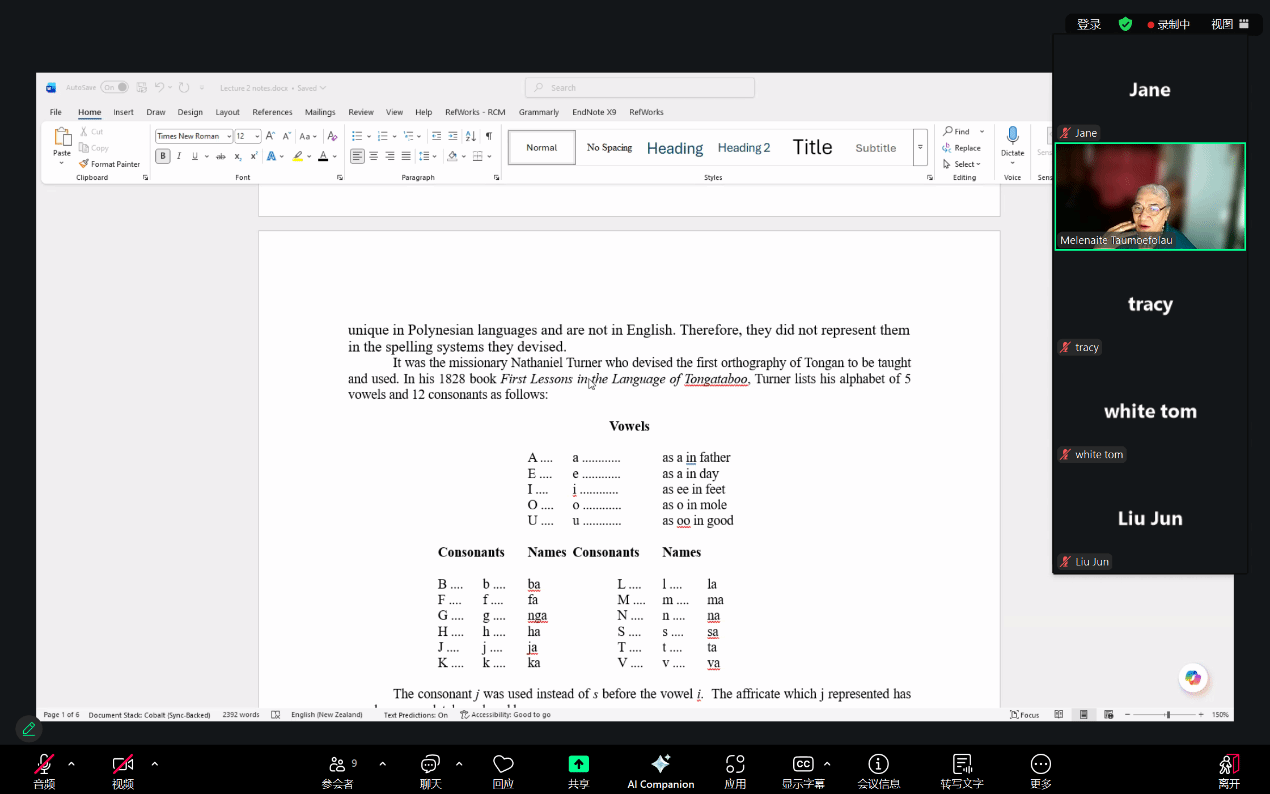 南太平洋语言与文化中心和世界语言博物馆邀请,汤加语外国专家梅莱奈伊特·塔乌莫艾富拉乌(Melenaite Taumoefolau)博士在线上做了题为“波利尼西亚语言语音学与正字法相关问题”(Issues in Polynesian Phonology and Orthography)的讲座。讲座由探花av
