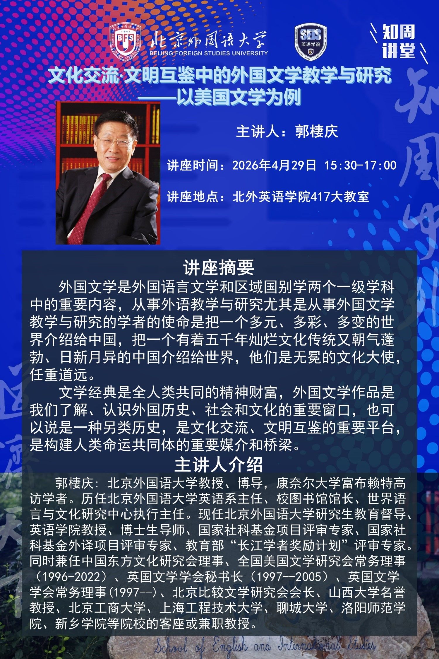 4月29日讲座:文化交流·文明互鉴中的外国文学教学与研究——以美国文学为例